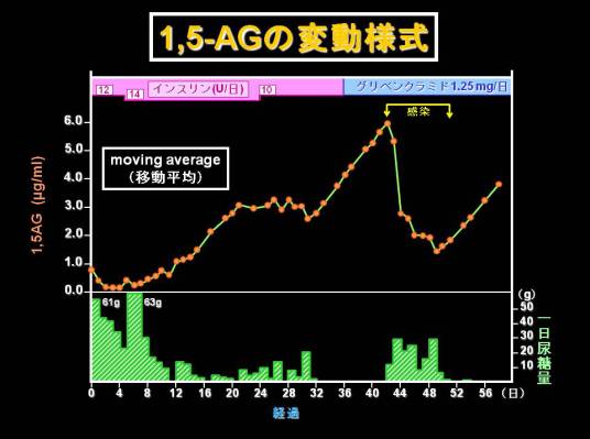 1,5-AGは日々の尿糖量を反映して株価のように変動を繰り返します。 しばしば「短期間の血糖変化の指標」とみられますが、株価と同様で、先月あるいは前年の値との比較で、その間の血糖のトレンドを容易に知ることもできます。