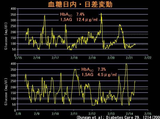 連続皮下グルコース濃度測定器(CGM)を用いた結果、同様なHbA1cレベルにおいても、血糖動揺性が強い例(下段)では、1,5-AGが相対的に低値となることが実証されています。このことはHbA1cが正常範囲内の例でも見られます。