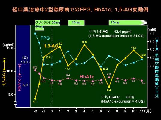 HbA1cだけを見ていると血糖の絶え間ない変化をしばしば見逃すことになります。 糖尿病は正常人よりも血糖の激しい変化が起き易いことも特徴です。 HbA1cが一見安定していても、血糖値や1,5-AGでみると血糖が極めて不安定であることが判明することもよくあります。