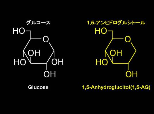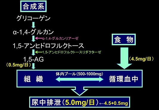 正常では99.9%が腎尿細管で再吸収されます。この再吸収はグルコース再吸収領域の下流で行われます。上流から過剰なグルコース(尿糖)が流れてくると、再吸収は競合阻害を受けて血中1,5AGの減少につながります。